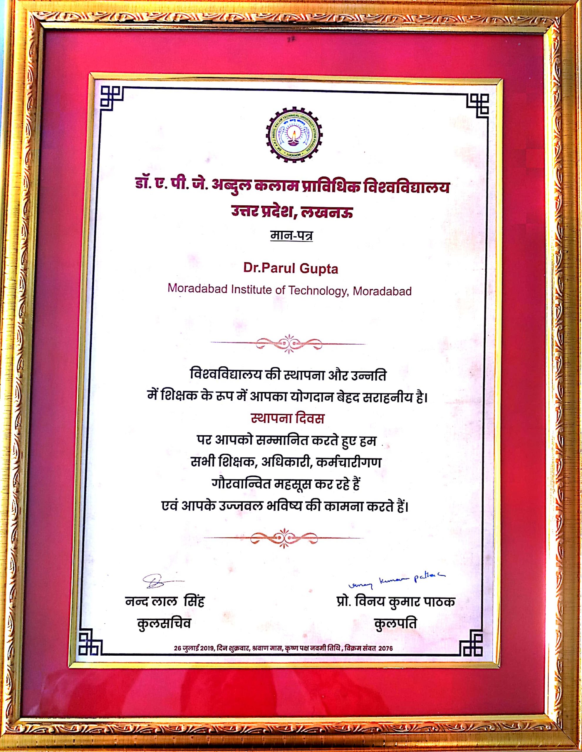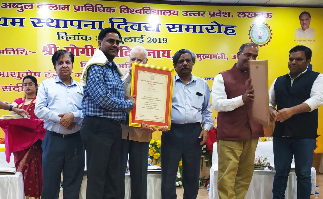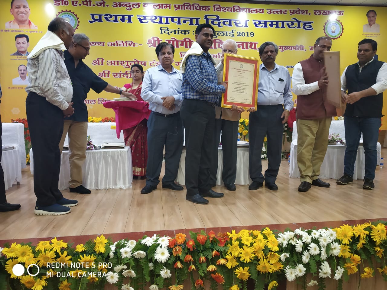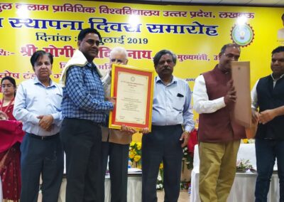 • Honour/Award received from Dr. APJ Abdul Kalam Technical University on the Foundation Day of the University on 26th July 2019 at Lucknow for contribution to the Technical Education and loyalty of 20 years in MIT Moradabad.