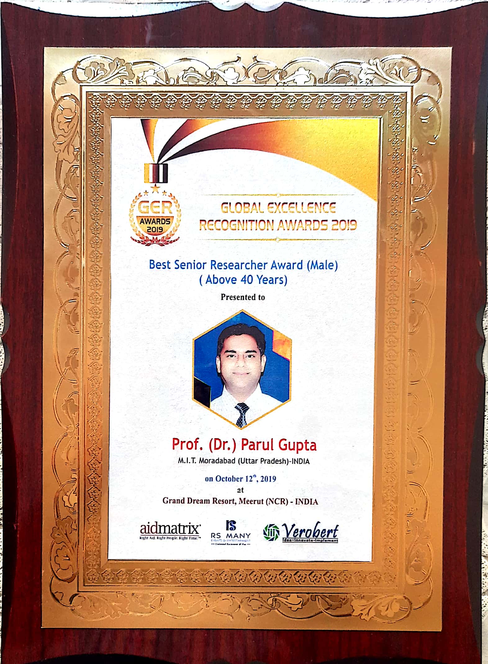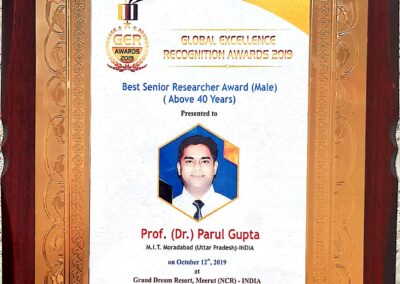 • Honour/Award received for the “Best Senior Researcher Award (Male) (Above 40 Years)” by “Global Excellence Recognition Awards (GERA-2019)” committee in recognition of my high potential and outstanding performance in my respective domain of working or specialization.  In addition of the recommendation and screening by experts for this Award, I have been chosen among a few Outstanding Individuals, who will receive the prestigious award in “Global Excellence Recognition Awards – 2019”. The award ceremony has held on October 12th, 2019 at Grand Dream Resort, Delhi-Dehradun Bypass Road, Meerut (NH-58), U.P, India.