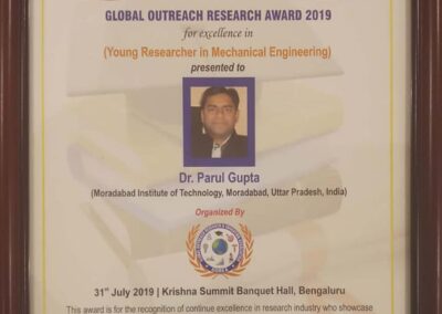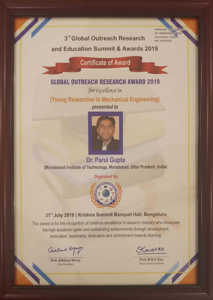 • Honour/Award received from Global outreach research award for excellence in Young Researcher in Mechanical Engineering on 31 July 2019 at Bangalore. This award is for the recognition of continue excellence in research Industry who showcase the high academic goals and outstanding achievements through development, innovation, leadership, dedication and commitments towards learning.