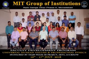 • FDP/Workshop (Refresher Level 1) on “Universal Human Values & Professional Ethics” sponsored by TEQIP-III & Dr. APJ Abdul Kalam Technical University, Lucknow, during 10-17 July 2018.
